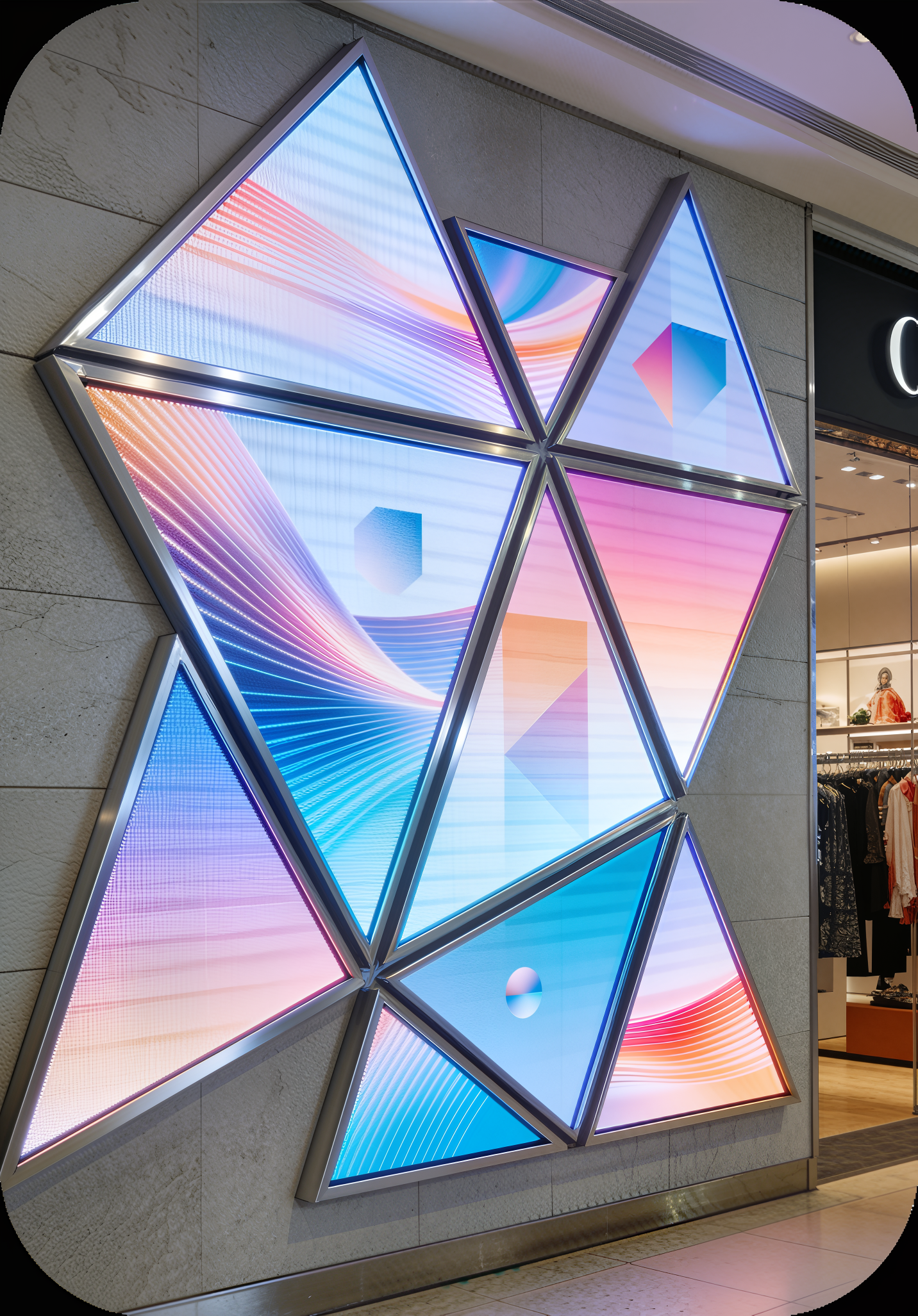採用獨特的三角形設計,可以 拼接成各種不同的圖案和形狀 ,展現出多變的效果,吸引目光。