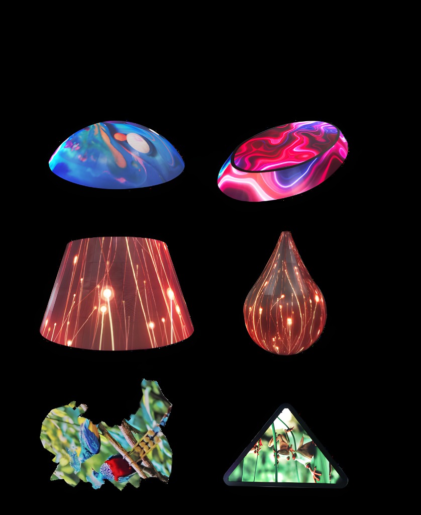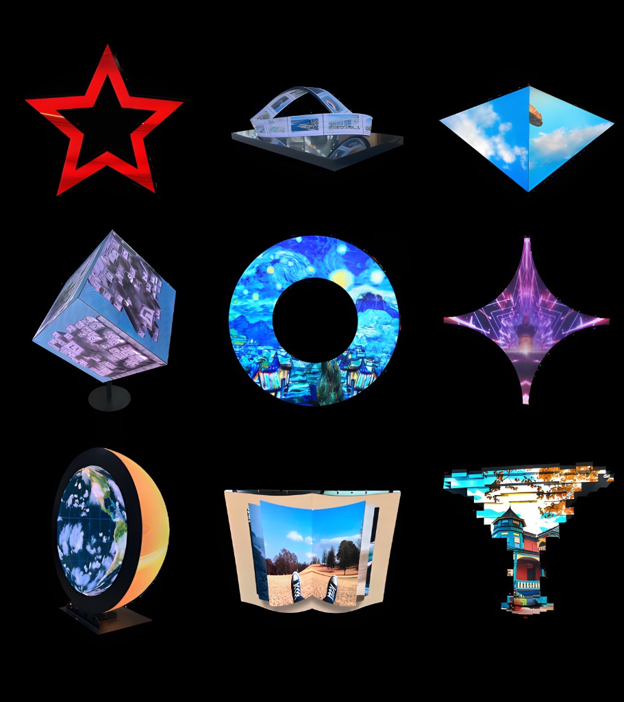 如 圓形、球形、曲面、L型、四方六面體、字母、各種造型 等,為觀眾帶來 動感和魅惑的光影世界 。