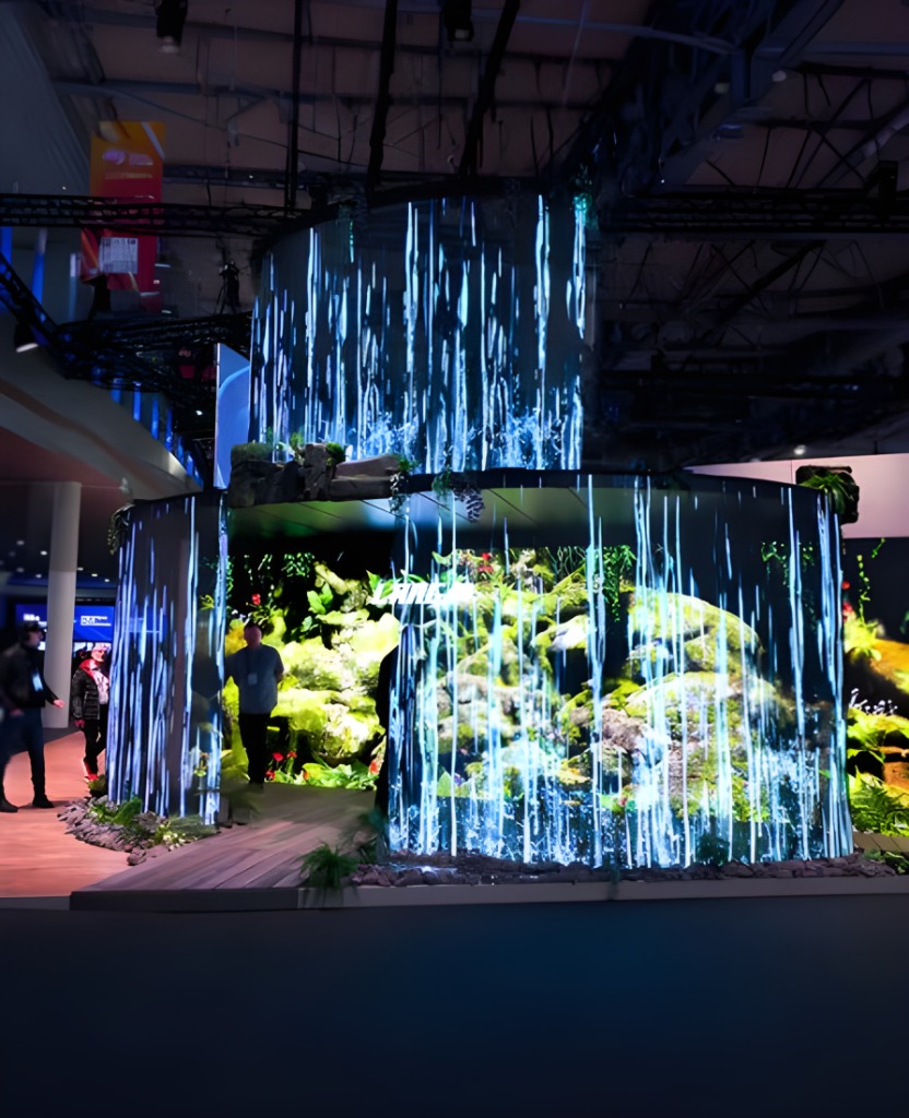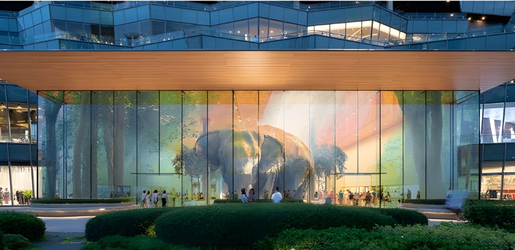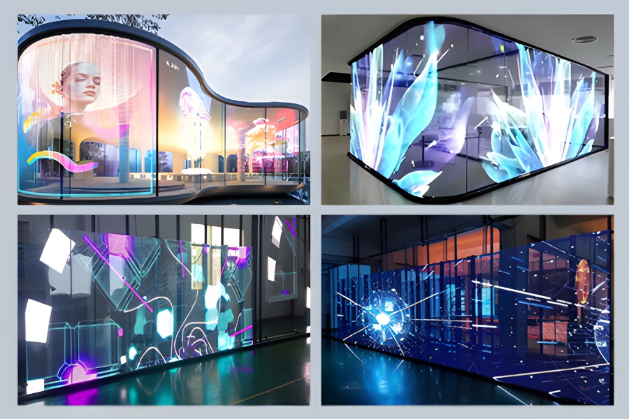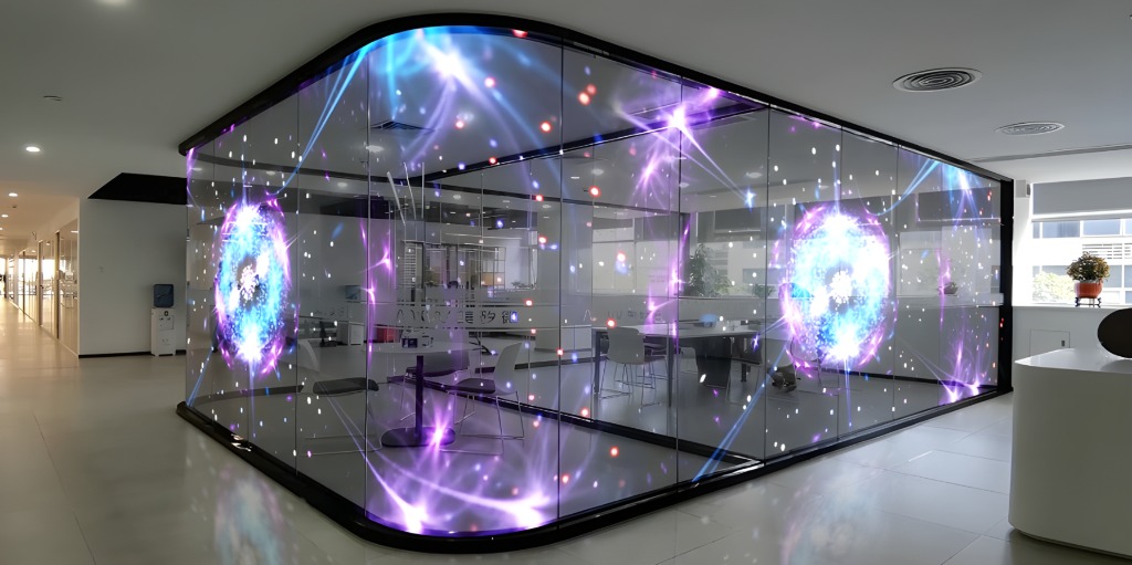 結合建築通透特性與動態影像播放,營造具穿透感的視覺效果;並可整合觸控、感應或多媒體控制系統,打造沉浸式互動展示空間。